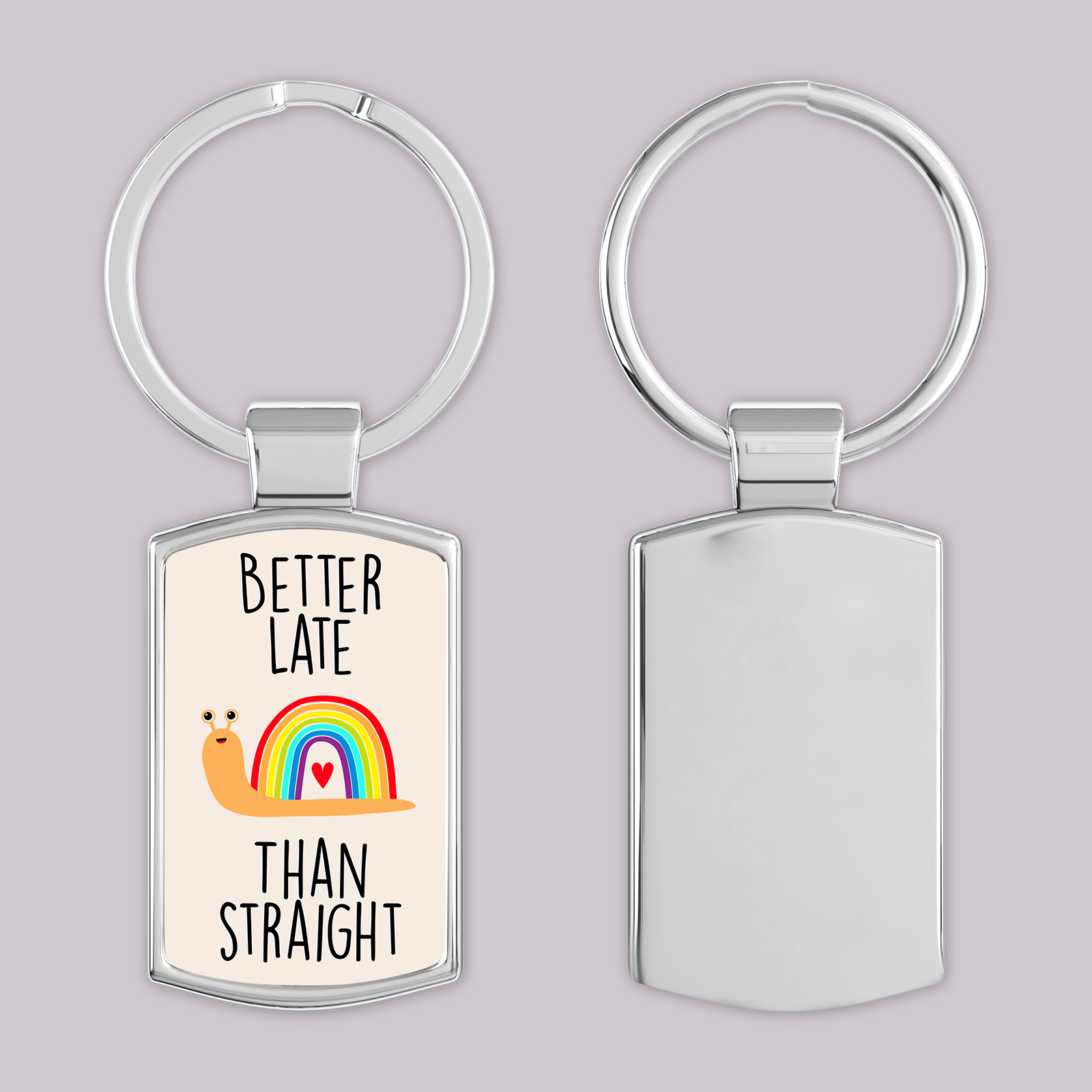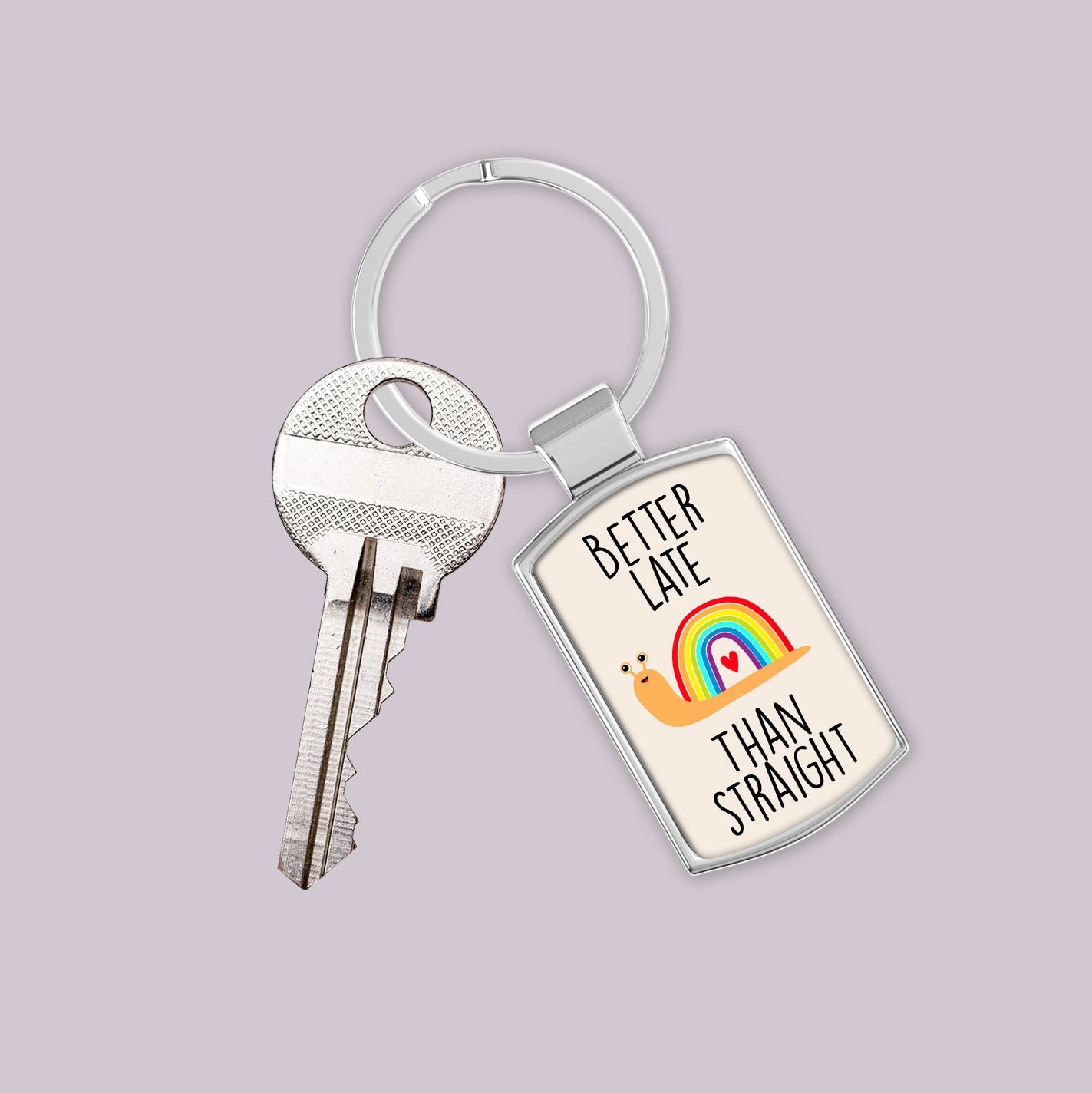 • LGBTQ+ Pride Keyring – Features a fun “Better Late Than Straight” design with a cute rainbow snail.
