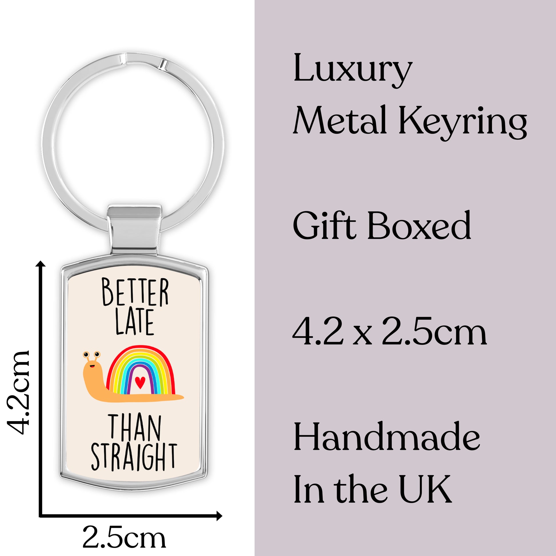 Celebrate love, identity, and humour with this Better Late Than Straight keyring. Featuring a cute snail with a vibrant rainbow shell and a heart, this high-quality luxury metal keyring (4.2 x 2.5 cm) is a perfect gift for LGBTQ+ individuals, allies, and those embracing their journey. Whether for a coming out celebration, birthday, or just a fun everyday accessory, this charming keychain adds personality to any set of keys. Handmade in the UK, this stylish and durable keyring comes in a gift box, ready for gifting.