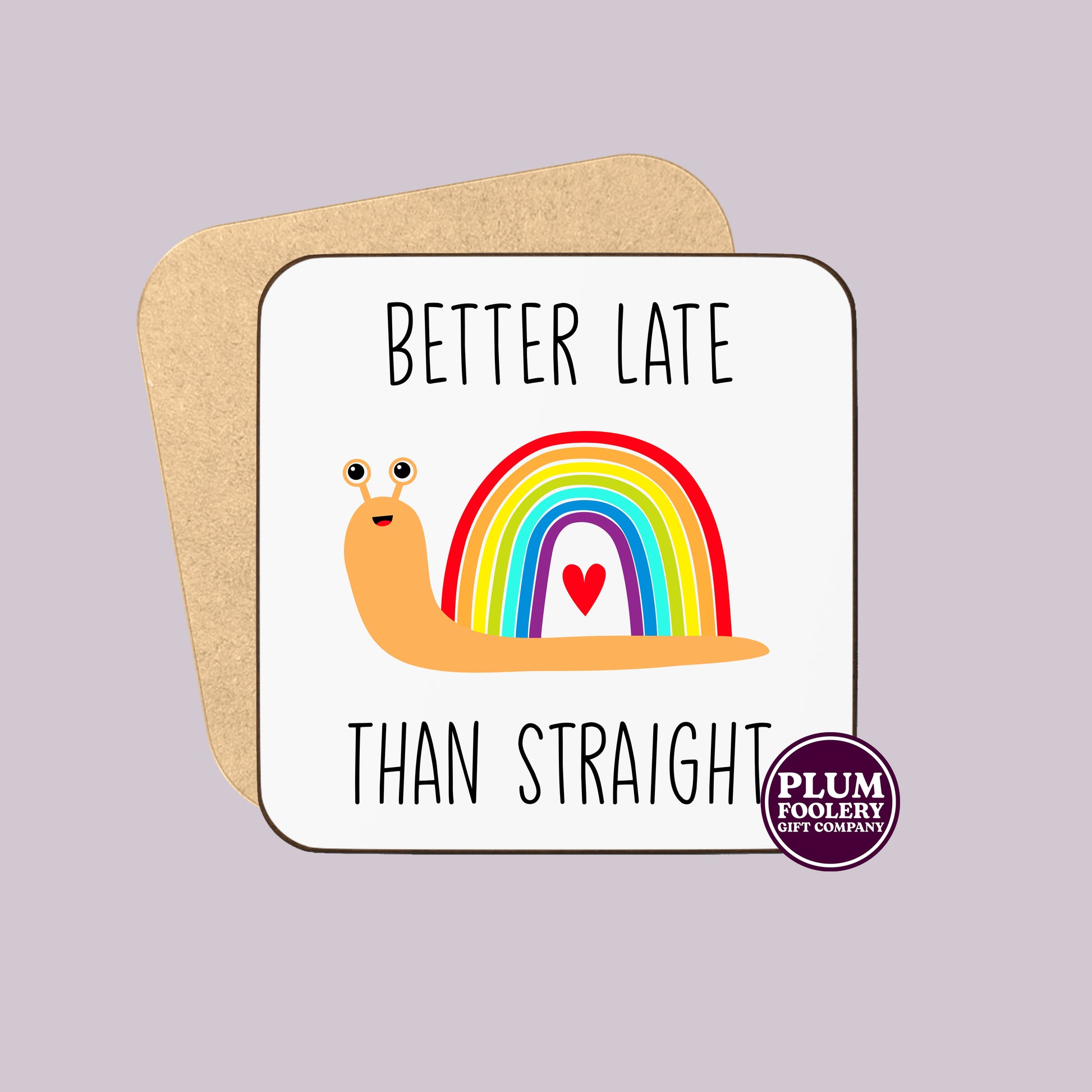 💜 Funny & Meaningful Design – “Better Late Than Straight” with a cute rainbow snail