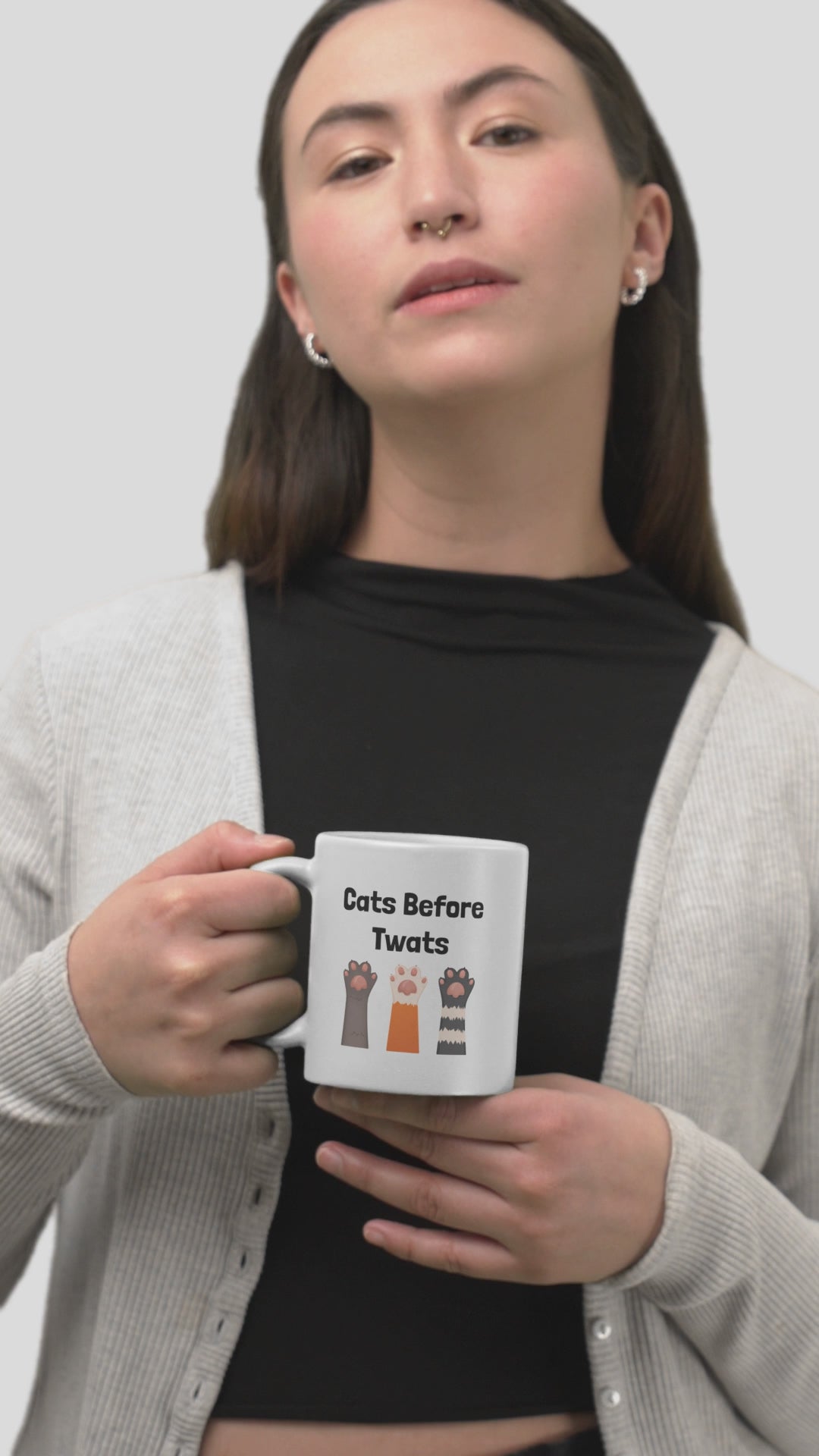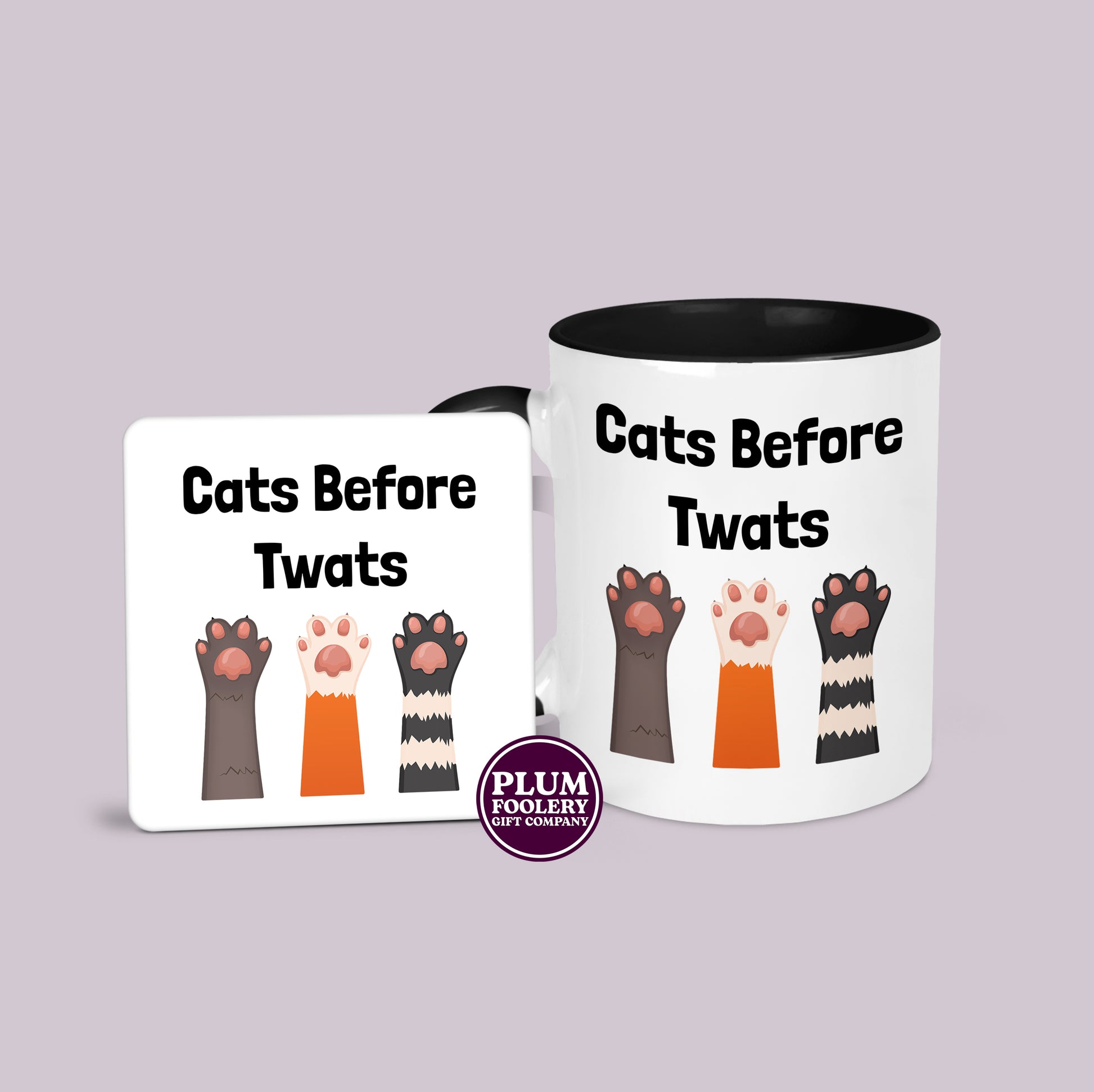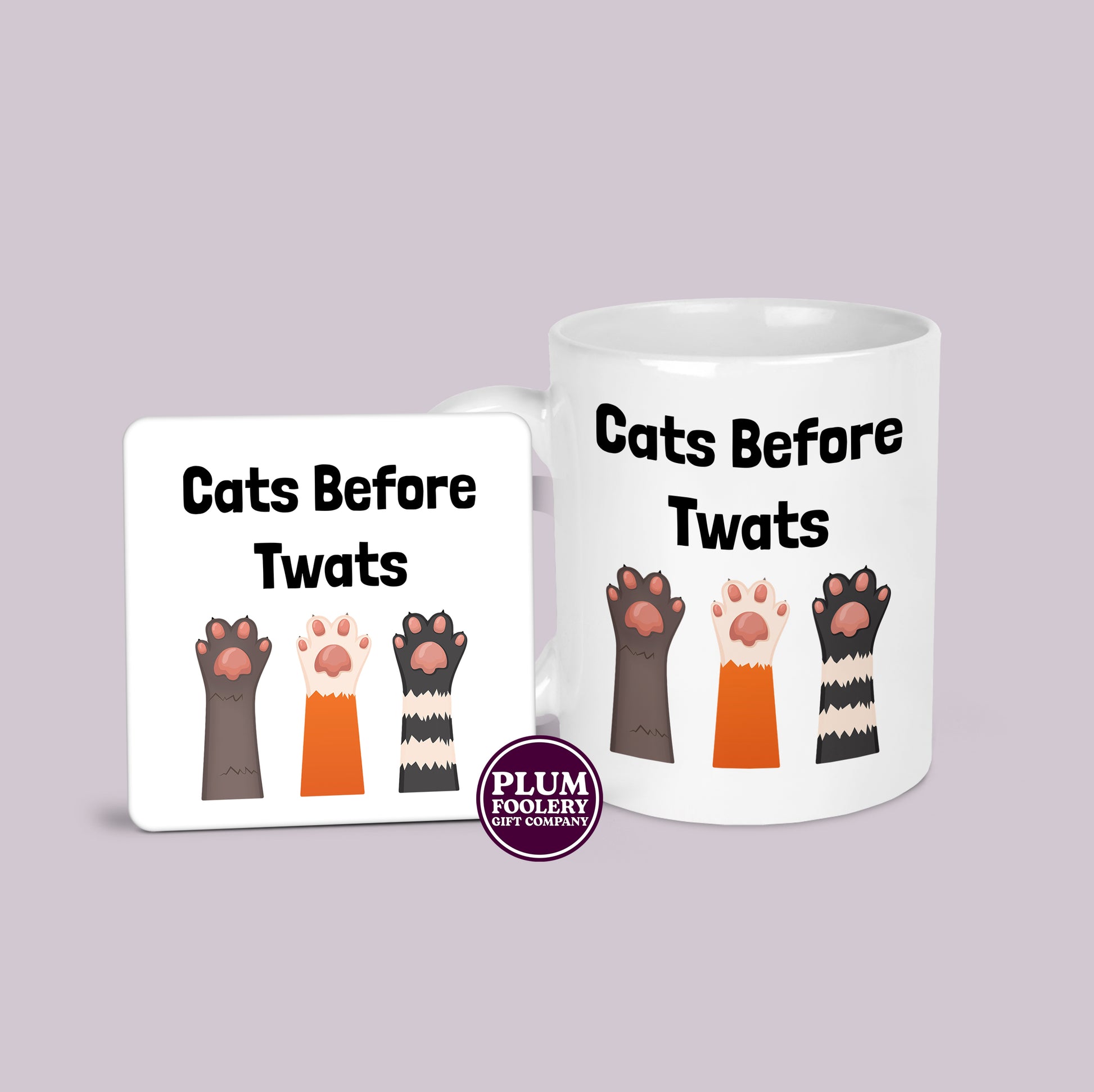 • Funny and sassy “Cats Before Twats” slogan with cat paw design