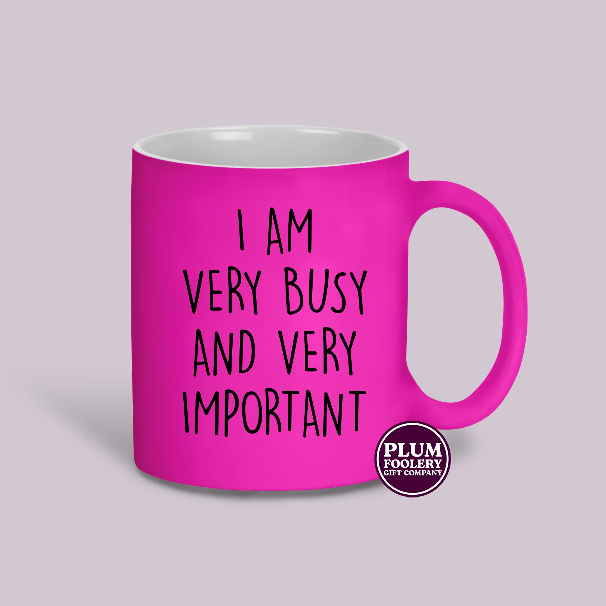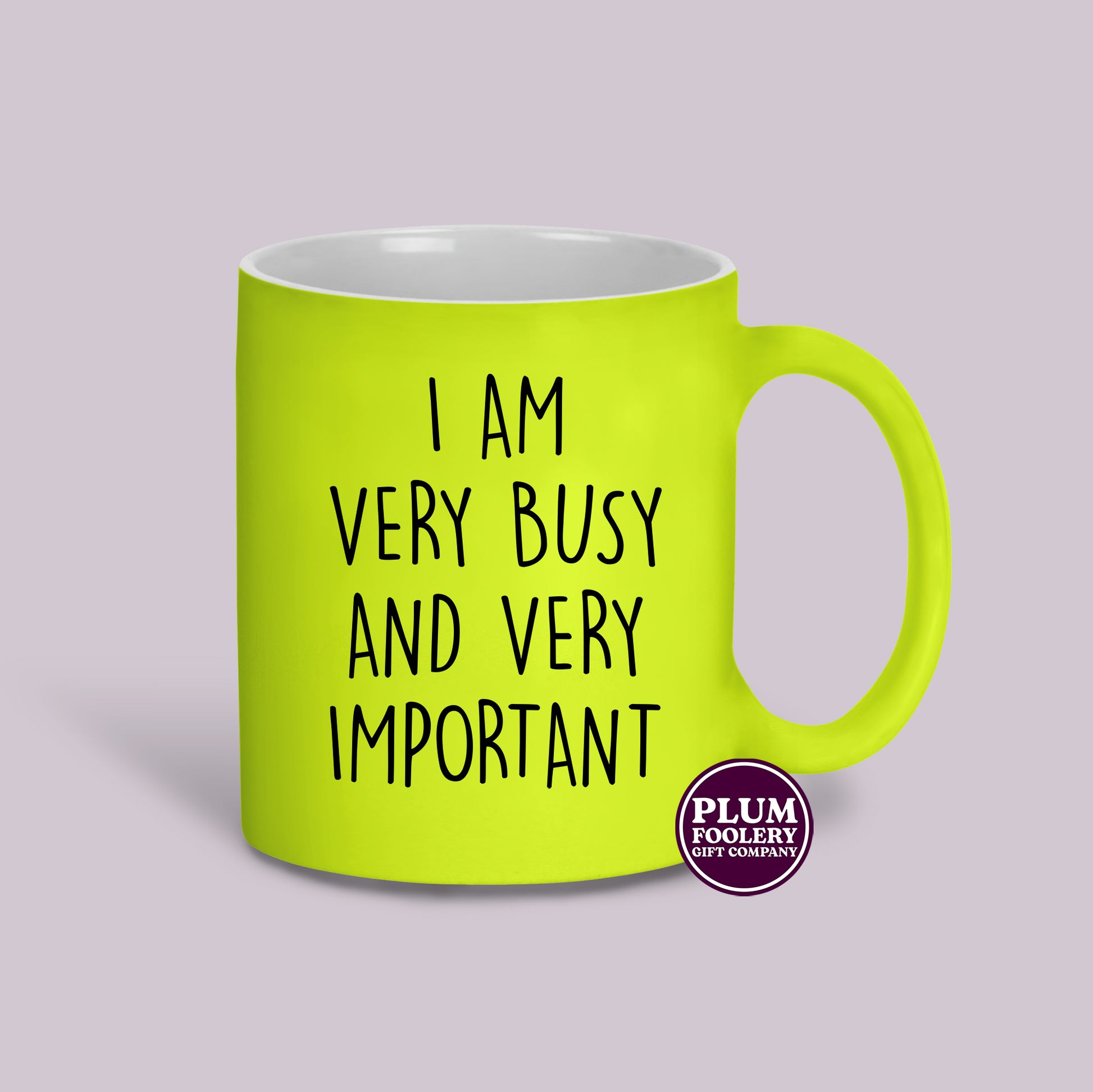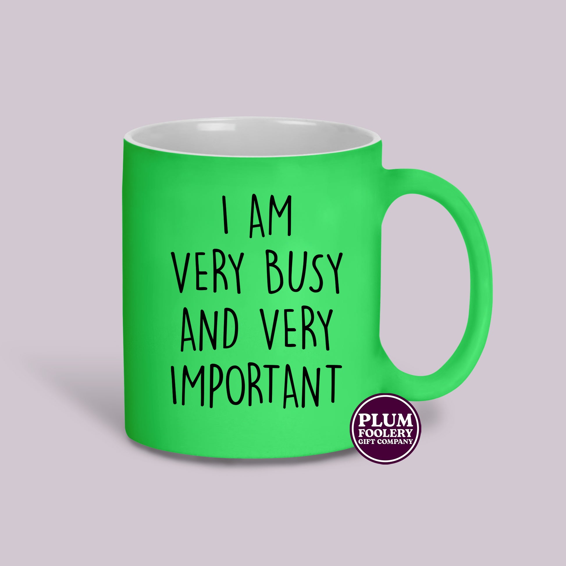 Brighten up your day with this bold and quirky neon ceramic mug, featuring the witty phrase, “I am very busy and very important” this mug adds a splash of fun to your morning routine or office desk. Handmade in the UK with high-quality ceramic, it’s designed to last and make you smile with every sip. Available in vibrant neon pink, neon yellow, and neon green, it’s the ideal gift for friends, family, or even yourself!