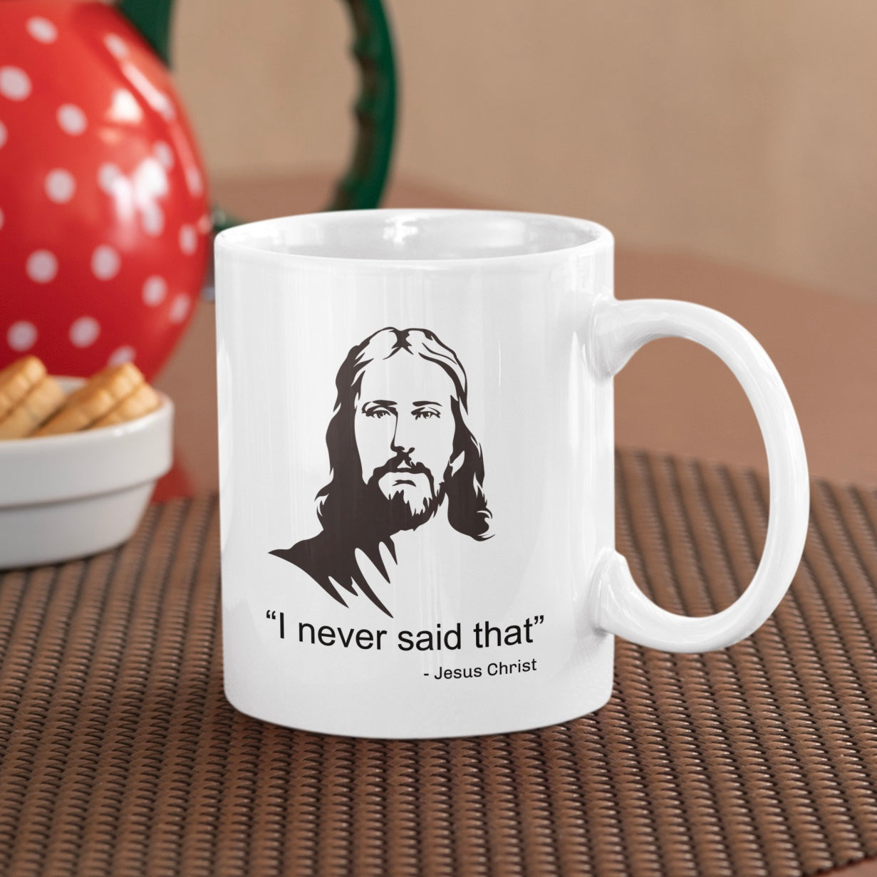 Add a bit of divine sarcasm to your morning brew with this hilarious “I Never Said That – Jesus Christ” mug. Featuring an illustrated image of Jesus alongside the witty quote, this mug is perfect for anyone who enjoys humour with a hint of holy irony.
