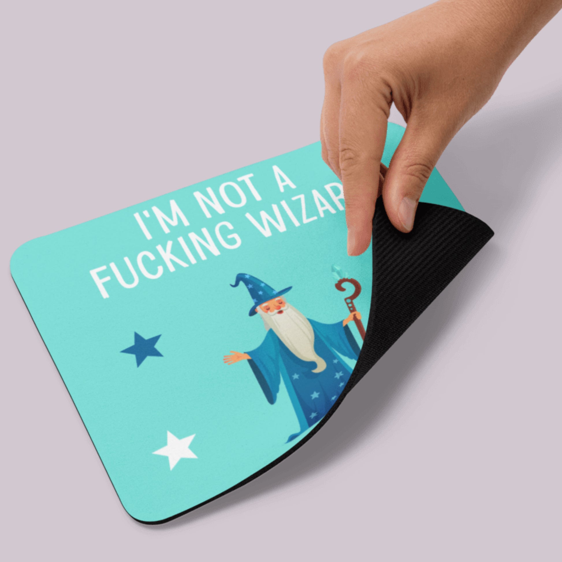 Add some personality to your workspace with this stylish and humorous mouse mat. Featuring the bold statement, “I’m not a fucking Wizard,” this desk accessory is perfect for professionals, students, and anyone with a sense of humour. Handmade in the UK, this high-quality fabric mousepad is designed for smooth mouse movement and comfort. The durable polyester surface ensures long-lasting use, while the non-slip rubber backing keeps it securely in place. Whether for work, gaming, or home use, this mouse mat makes a great gift or a fun addition to your desk setup.