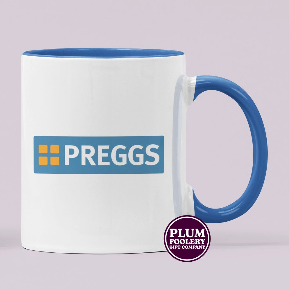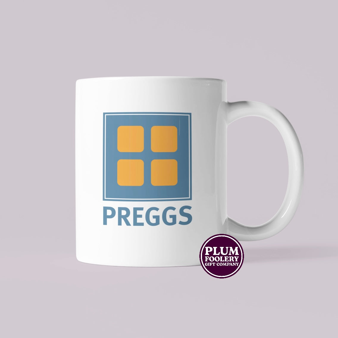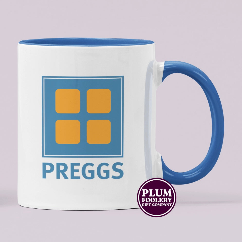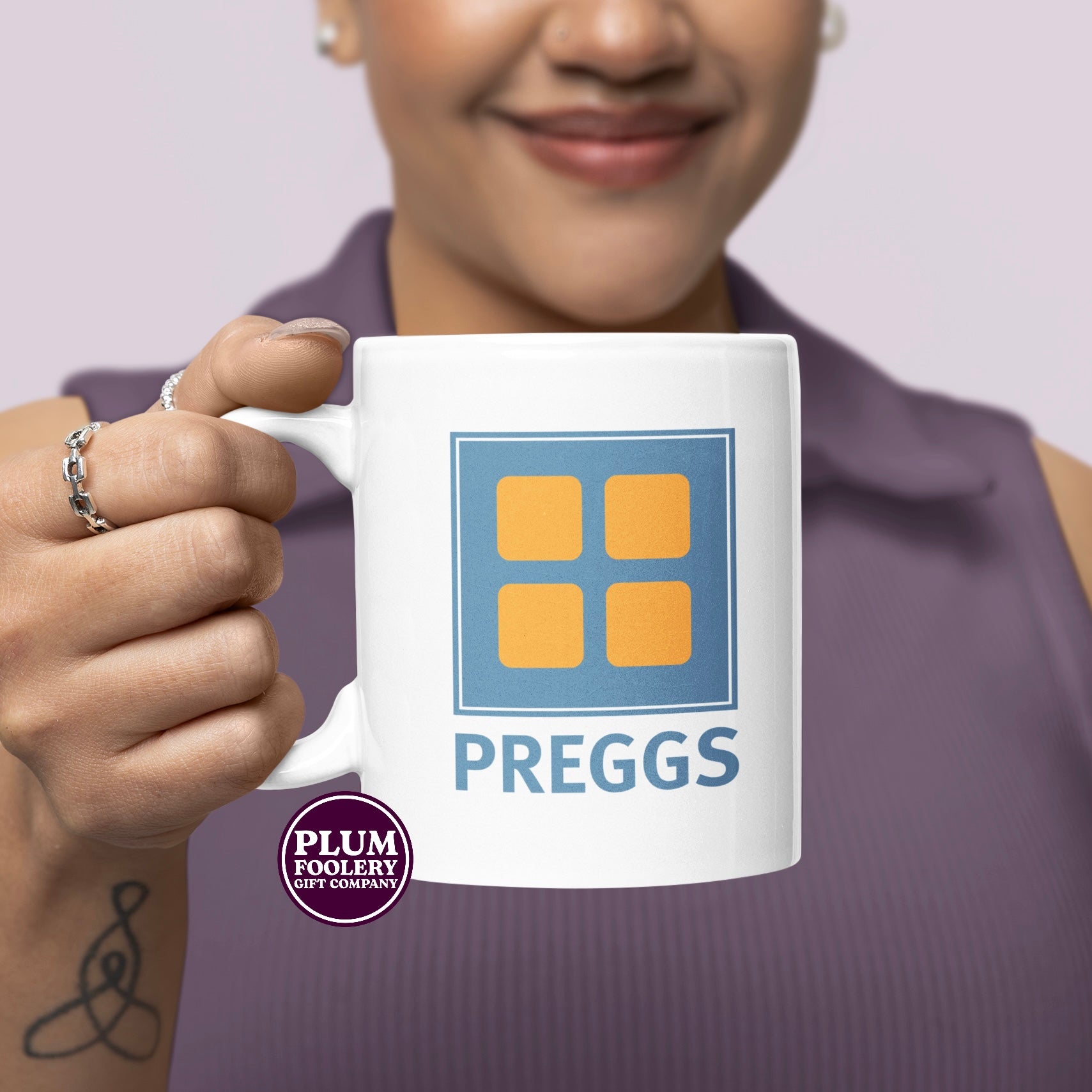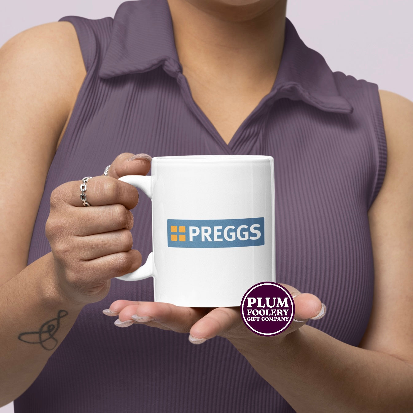 Greggs-Inspired Parody: A playful take on the iconic Greggs logo, this mug features the word “Preggs” in a fun, tongue-in-cheek design.