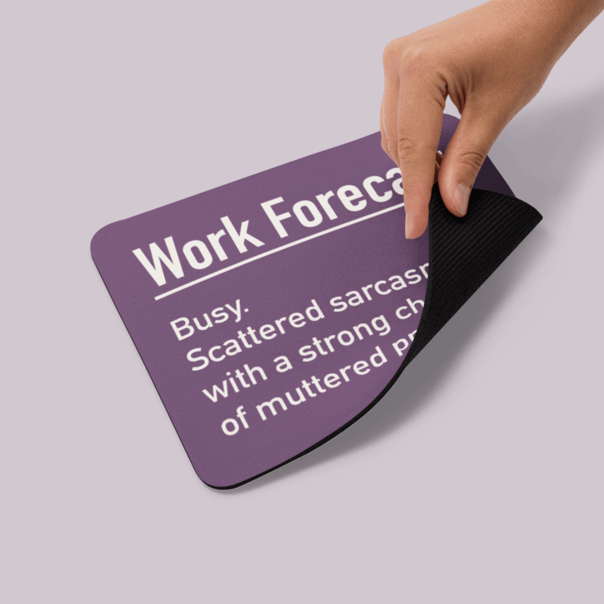 Bring some humour to your workspace with this funny and relatable “Work Forecast” mouse mat. Perfect for those who deal with busy schedules, scattered sarcasm, and a strong chance of muttered profanities! Designed for both style and function, this high-quality fabric mousepad ensures smooth mouse movement, while the non-slip rubber backing keeps it securely in place. With a comfortable 5mm thickness, it provides a cushioned feel for everyday use. Handmade in the UK, this office desk accessory makes a fantastic gift for colleagues, friends, or anyone who enjoys a bit of workplace humour.
